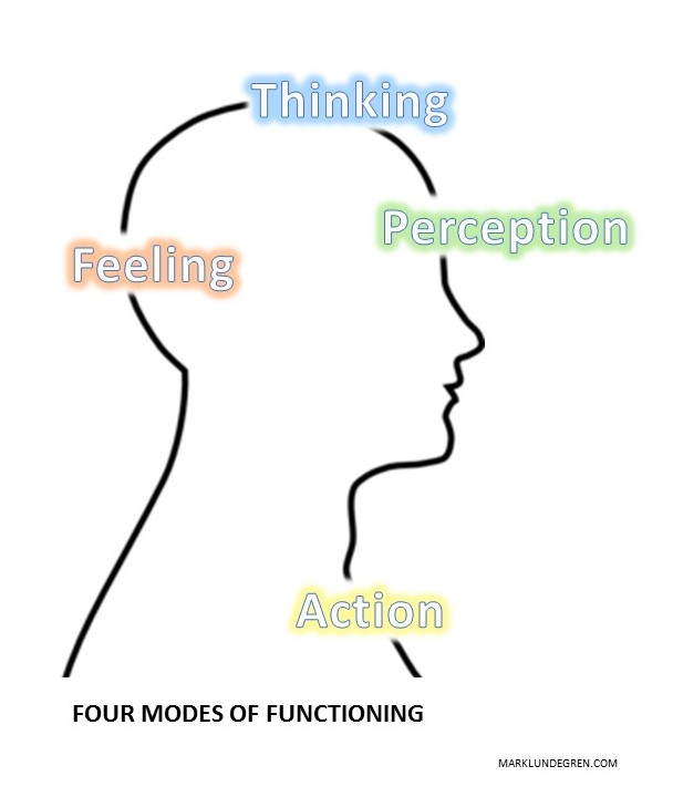 > Our Functional Biases – in practice, most of us are naturally, culturally, experientially, or otherwise drawn toward one or two modes of functioning in this four-part model of the self (see Personal Styles for a useful treatment of this idea). And while we may be personally biased toward perception, without intentional guidance and cultivation of this characteristic, achieving and leveraging the trait of attentive perception is exceptional in many or most cultures and settings. In practice, and perhaps simply owing to the natural or situational demands of daily life, most of us tend to be biased toward: 1) thinking, feeling, or action, 2) some combination of these three often dominating modes of functioning, or 3) perceiving that is strongly, unconsciously, or inattentively colored and constrained by these other modes of natural functioning.