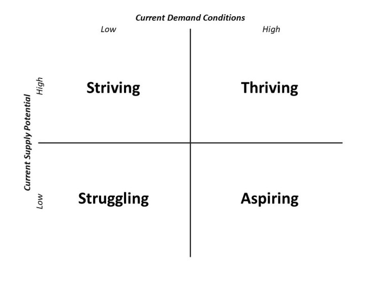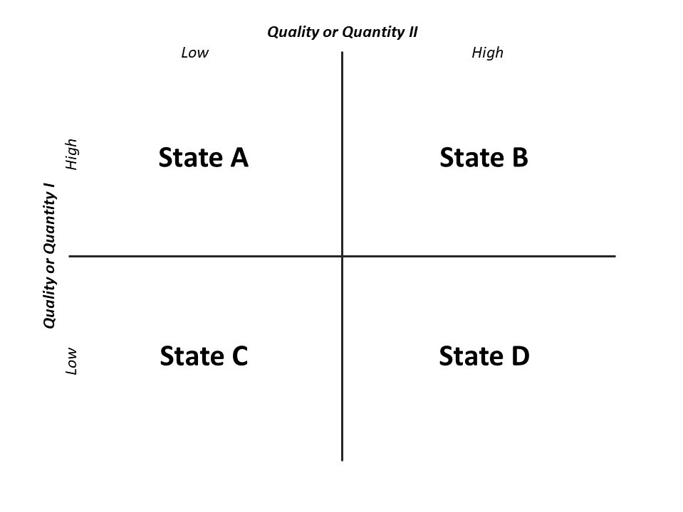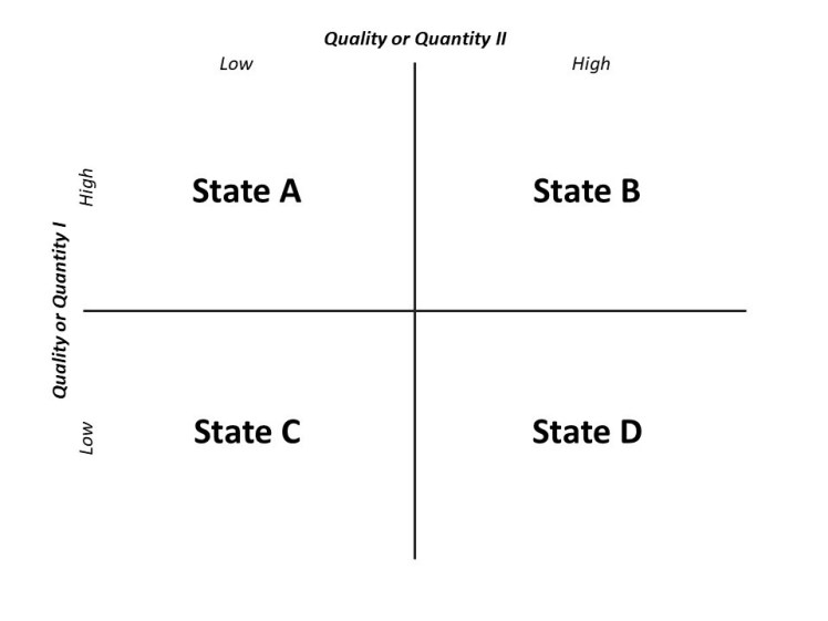 A second extension of data tables, also involving two-dimensional plots or organization of various information elements, are today’s ubiquitous use of 2×2 or four-quadrant matrix models by analysts of all kinds (a prototypical example of which is shown below). In practice, matrix models or charts, like two-dimensional organizing data tables and plots, are a simple, effective, and intuitive aid to multi-dimensional thinking. And like these other tools, and perhaps especially when focusing on essential qualitative differences, matrix models often can sometimes offer comparatively deep insights into fundamental patterns or relationships, whether in a particular data set or the data set that is the world broadly, and especially compared with unaided thinking. For example, consider a matrix plot of a large number of potential endeavors, or potential escapes from thinking life if you want, against the essential (and metacognitively surfaced) qualities of safe and valuable – as opposed to perhaps more intuitive, visceral, or monolithic considerations of exciting and easy – and you perhaps can see how such multi-dimensional graphical aids might help us and our groups better visualize options and in turn function in vastly superior ways – amid and throughout life, and thus compoundingly or increasingly so.