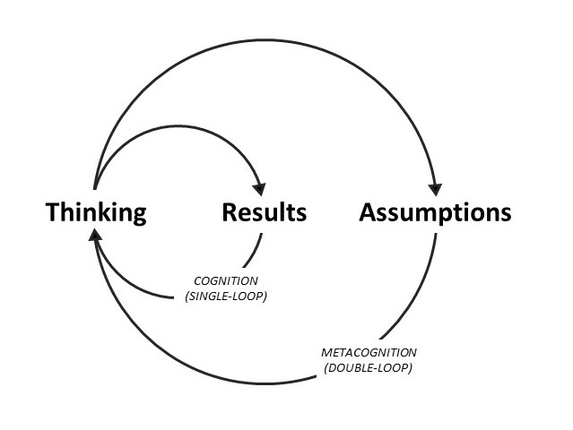 In personal and organizational psychology, and as the preceding graphic indicates, the processes of cognition and metacognition are often described, modeled, or thought of (reductionistically but often helpfully) as single-loop and double-loop functioning or learning. Here, the concept of single-loop functioning summarizes the idea that in cognition or simple thinking , we are often significantly dedicated to matters at hand and thus less reflective or cognitively observant overall. By contrast, the idea of double-loop functioning highlights our cognitive capacity not only to assess our results and adjust our goal-directed thinking and actions, but also to engage in a second metacognitive or reflective loop of thought where we evaluate the assumptions, briefs, thought processes, or cause-and-effect theories underlying our goals or behavior as well, or instead (see Wikipedia Double-Loop Learning).