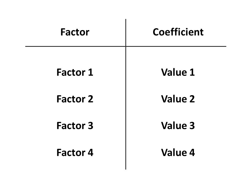 As you may know, multivariable analysis and machine learning involve a set of mathematical techniques that require training and care, but can provide essential and far-reaching insights that would not be available to us otherwise. And while the topic of multivariable mathematics and related data tools are beyond the scope of our current discussion, one central feature of this mathematics and its application is very much at the heart of it. This is the typical mathematical practice of summarizing or organizing complex results in a two-dimensional tabular format or frame, either as shown prototypically immediately above or in that of two-dimensional organizing equations (ones with length and depth, rather than length and height). Importantly, this common final step in multivariable or regression analysis offers basic insights into the workings and needs of our human minds. It is also a study in natural demands for simplicity or clarity and satisficing or expediency in human cognition, and likely in all cognition. And crucially, it suggests a means or alternative way to conduct complex multivariable analysis and manage multi-dimensional thinking within simple information models or framings, and perhaps with sufficient rigor and adequate results in a many cases.